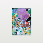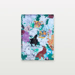 【ジャングル】さまざまな動物を描いた絵を、動物ごとにその輪郭に沿ってハサミで切り抜き、1枚の紙の上に糊で貼り合わせたコラージュ作品。シンプルな線によって、動物それぞれの特徴や性質をとらえている。