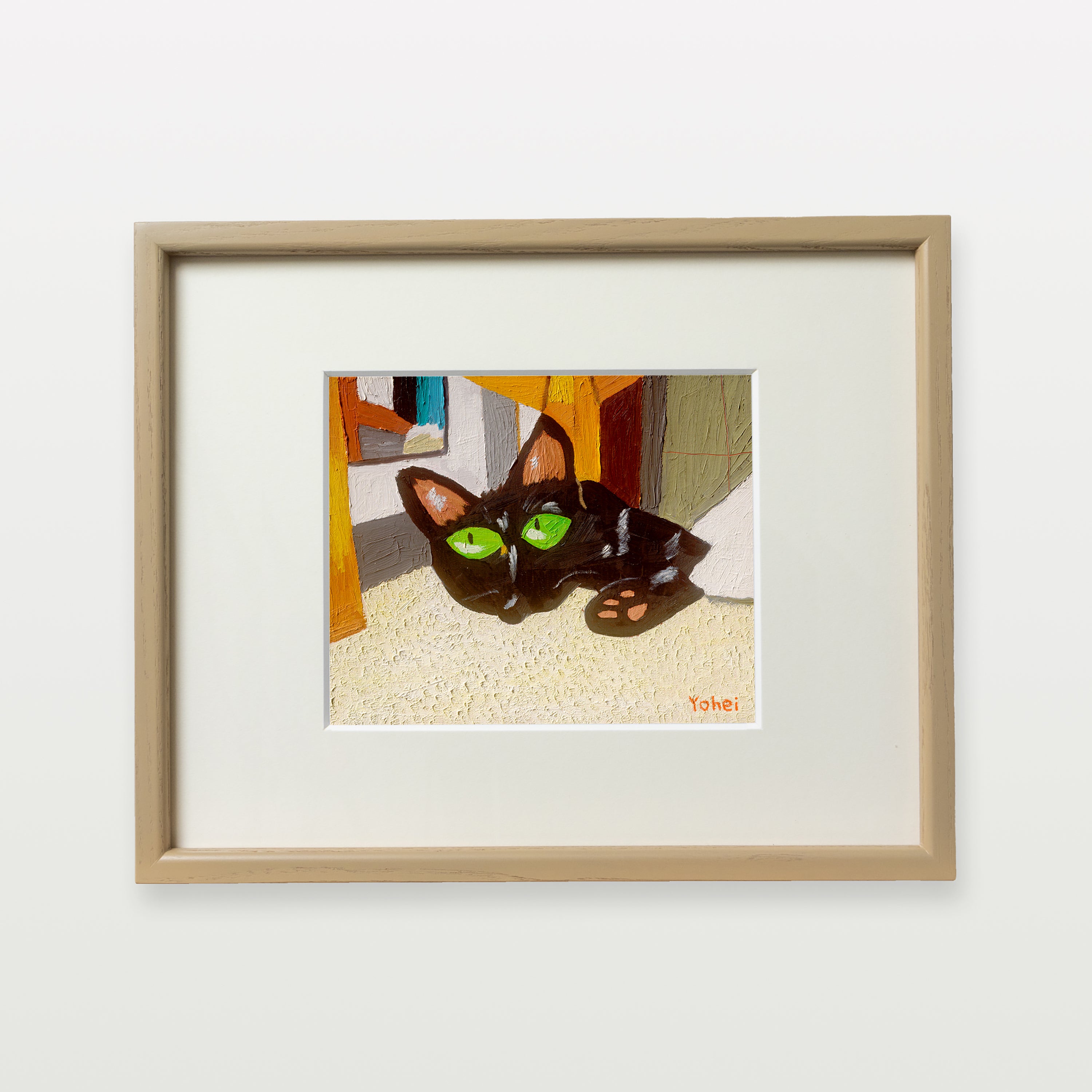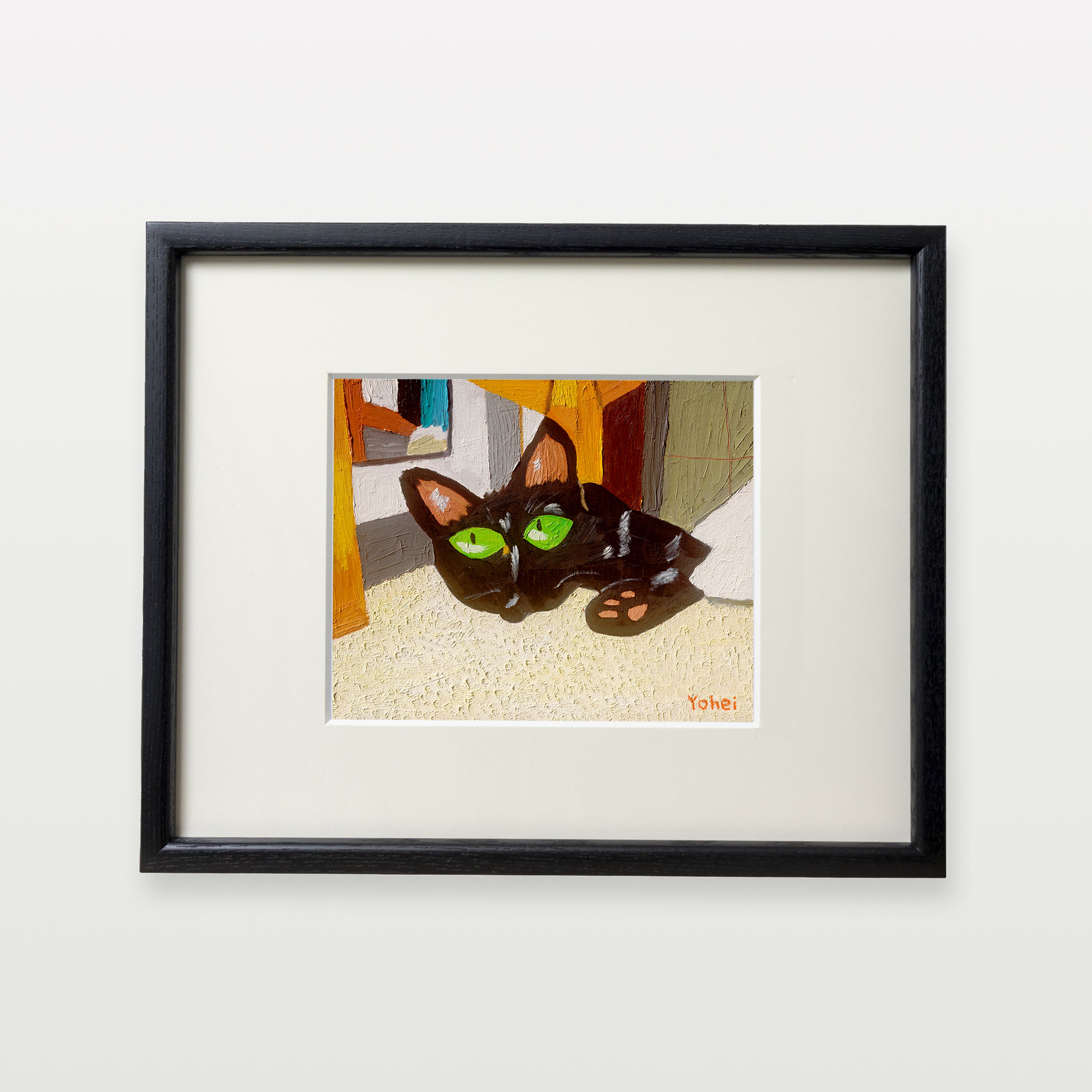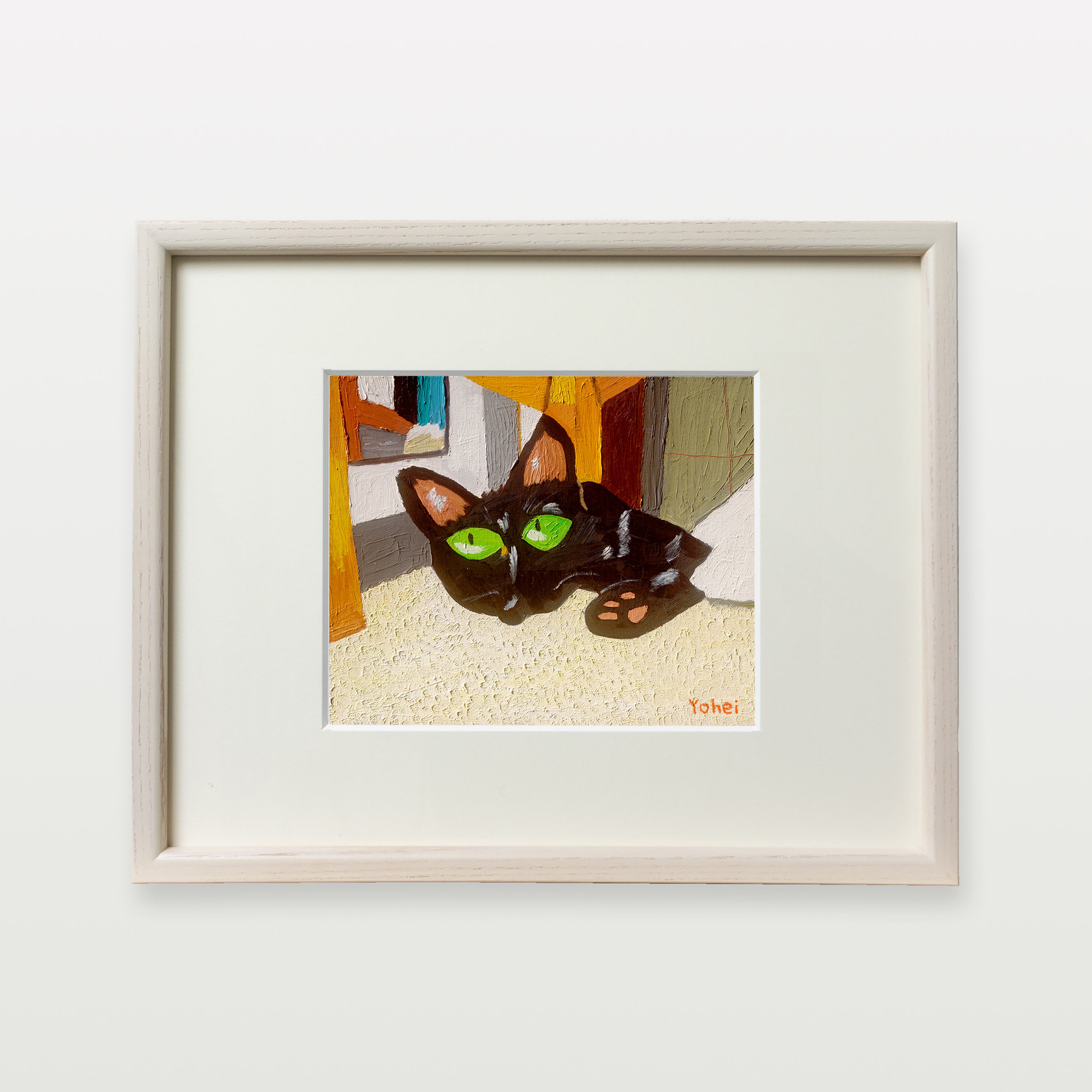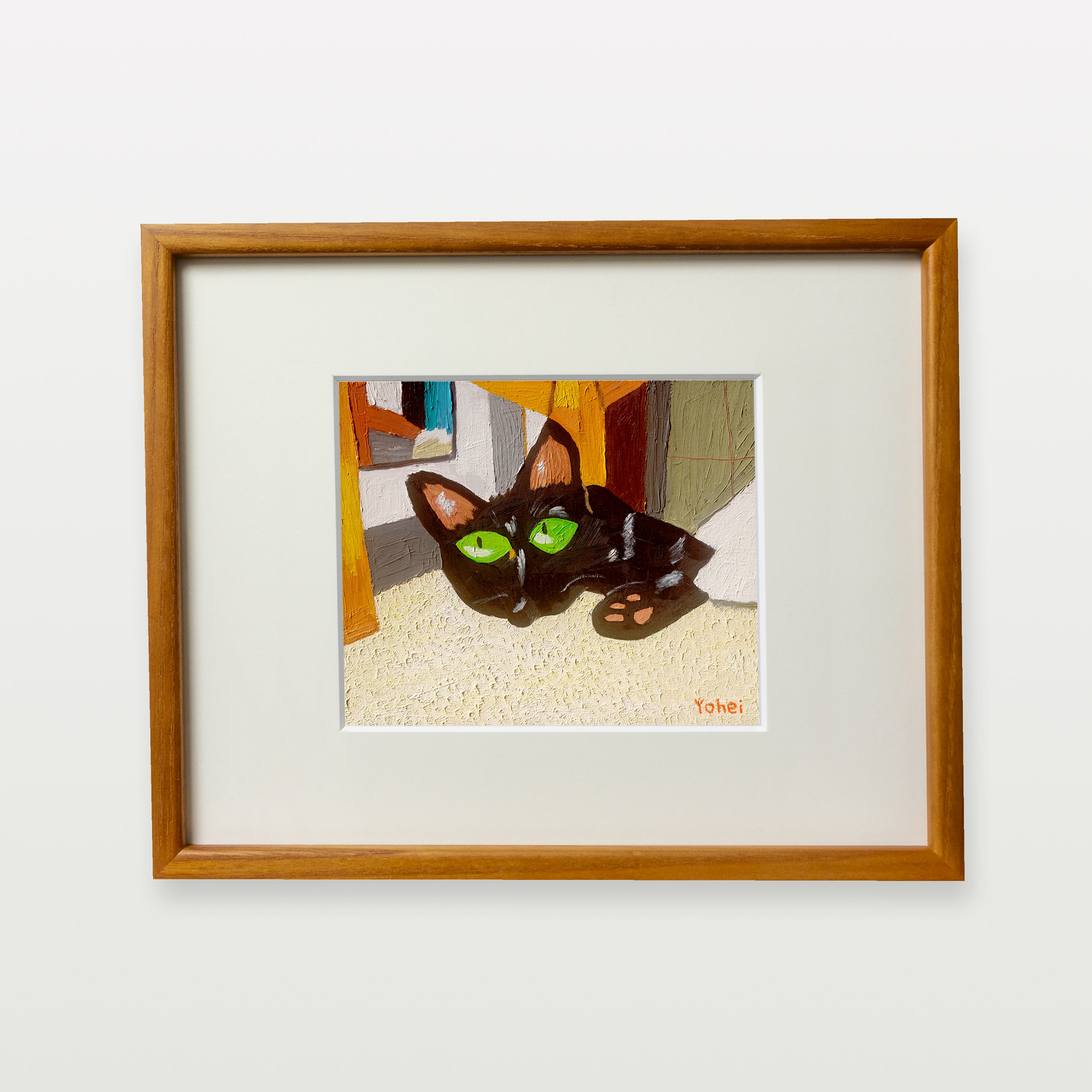 一時的に自宅に預かった黒猫を描いた。慣れない環境の中で、上目遣いに辺りを伺う猫の姿をアクリル絵の具で色鮮やかに表している。細木さんの鋭い観察眼により、その個性が際立つようにデフォルメされている。